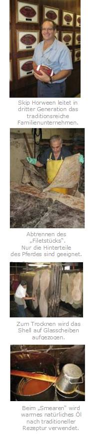 Das „Shell Cordovan“ verdankt seinen Namen den schildförmigen Lederstücken aus den Flanken (der Kruppe) des Pferdes. Die Herstellung ist ein Geduldsspiel: