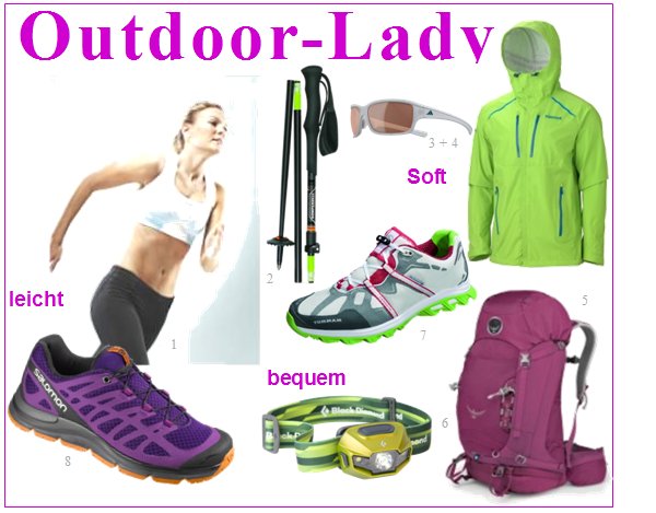 Sport BH vonCRAFT / Damenstöcke Komperdell / Outdoorjacke Mammut / Sportbrille adidas / Damenrucksack Kestrel / Stirnlampe ReVolt / Schuhe Mammut + Salomon / Alltagstaugliche Outdoorschuhe